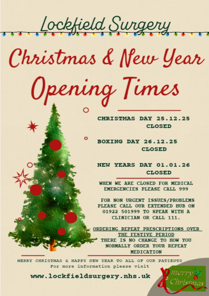 Lockfield Surgery Christmas & New Year Opening Times Posted by: jakebaugh - Posted on: 22nd December 202522nd December 2025